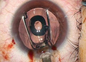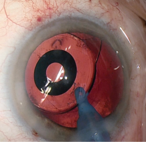 In some eyes, the outside diameter of the IC-8’s opaque ring is smaller than the pupillary diameter, so light can come around the outside of the opacity. This has not caused a problem in my experience. I have successfully implanted the IC-8 in young patients with large pupils.