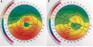 Figure 7. Before (A) and after (B) topography-guided laser ablation to regularize the central cornea of the eye in Case No. 3.